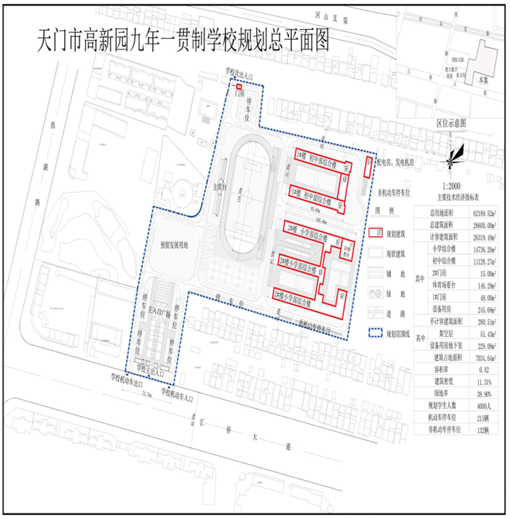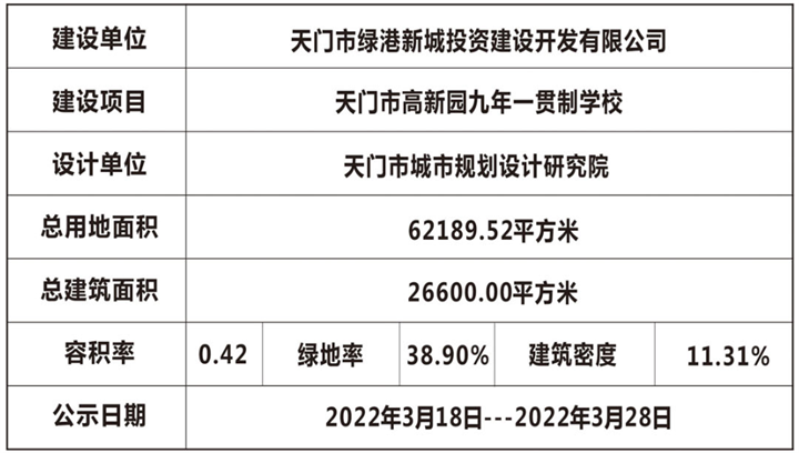 天门市绿港新城投资建设开发有限公司申报的天门市高新园九年一贯制学校项目,位于汇桥大道与西湖路交汇处。规划拟新建3栋建筑及相关配套设施,其中1栋4层小学部综合楼,1栋5层初中部综合楼,1栋1层配电房。该项目总建 筑面积为26600.00平方米,计容总建筑面积为 26319.49平方米,容积率为0.42 ,日照分析满足规范要求.具体详见规划总平面图、日照分 析图和效果图。经我局审查,拟同意批准该项目规划方案,现将拟批准的规划总平面图予以 公示。有关单位或个人如对此规划有异议,请在公示期间向市自然资源和规划局提出书面异议书。