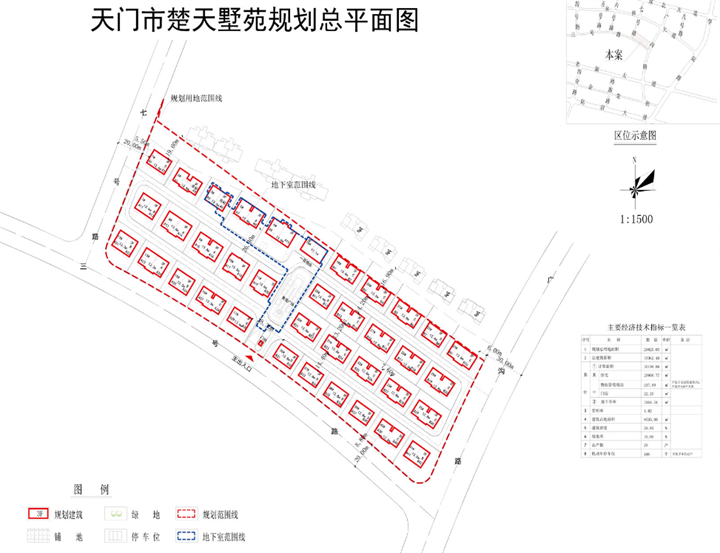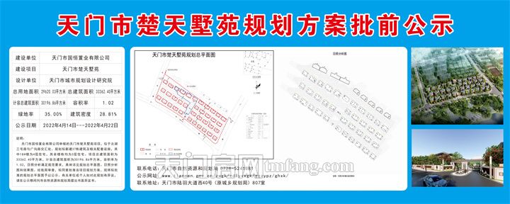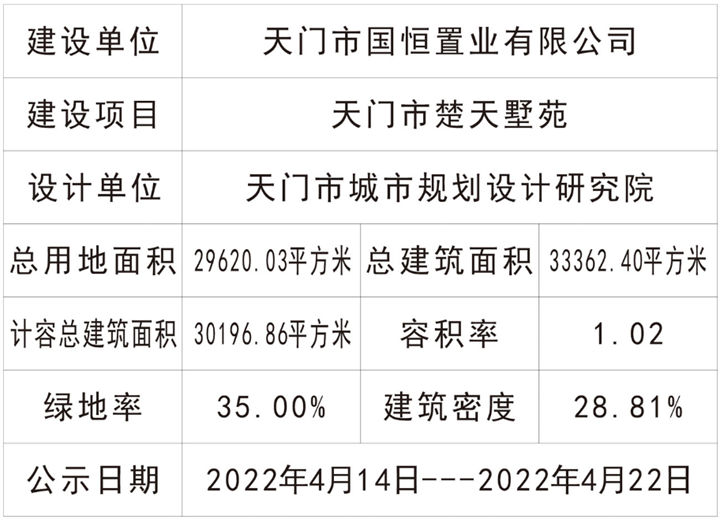 天门市国恒置业有限公司申报的天门市楚天墅苑项目,位于北湖三号路与广沟路交汇处。规划拟新建37栋建筑及相关配套设施,其中18#楼为 4 层住宅,其余楼栋均为 3 层住宅。项目总建筑面积为计容总建筑33362 . 40 平方米,计容总面积为30196.86平方米,容积率为 1 . 02 ,日照分析满足规范要求,具体详见规划总平面图、日照分析图和效果图。经我局审查,拟同意批准该项目规划方案,现将拟批准的规划总平面图予以公示。有关单位或个人如对此规划有异议,请在公示期间向市自然资源和规划局提出书面异议书。