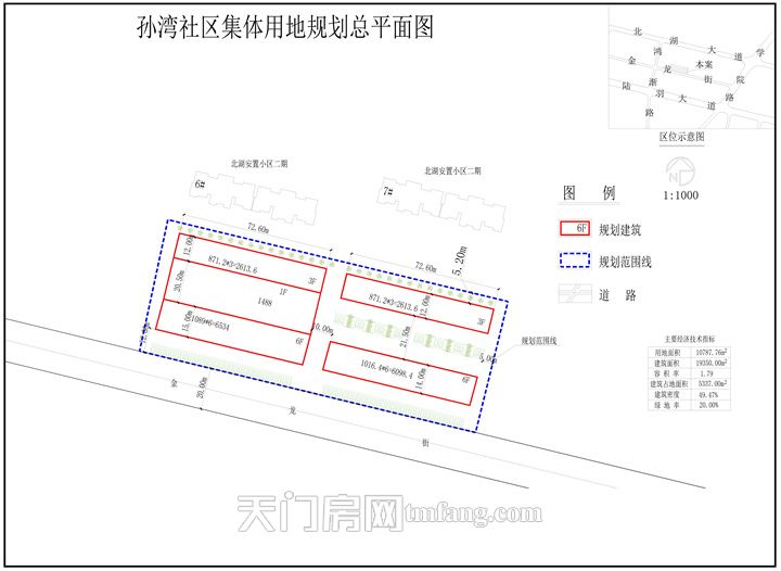 天门市竟陵办事处孙湾社区居民委员会申报的孙湾社区集体用地项目,位于鸿渐路与金龙街交会处。规划拟新建3栋建筑及相关配套设施,项目总建筑面积为19350.00平方米,容积率为1.79,具体详见规划总平面图和效果图。经我局审查,拟同意批准该项目规划方案,现将拟批准的规划总平面图予以公示。有关单位或个人如对此规划有异议,请在公示期间向市自然资源和规划局提出书面异议书。