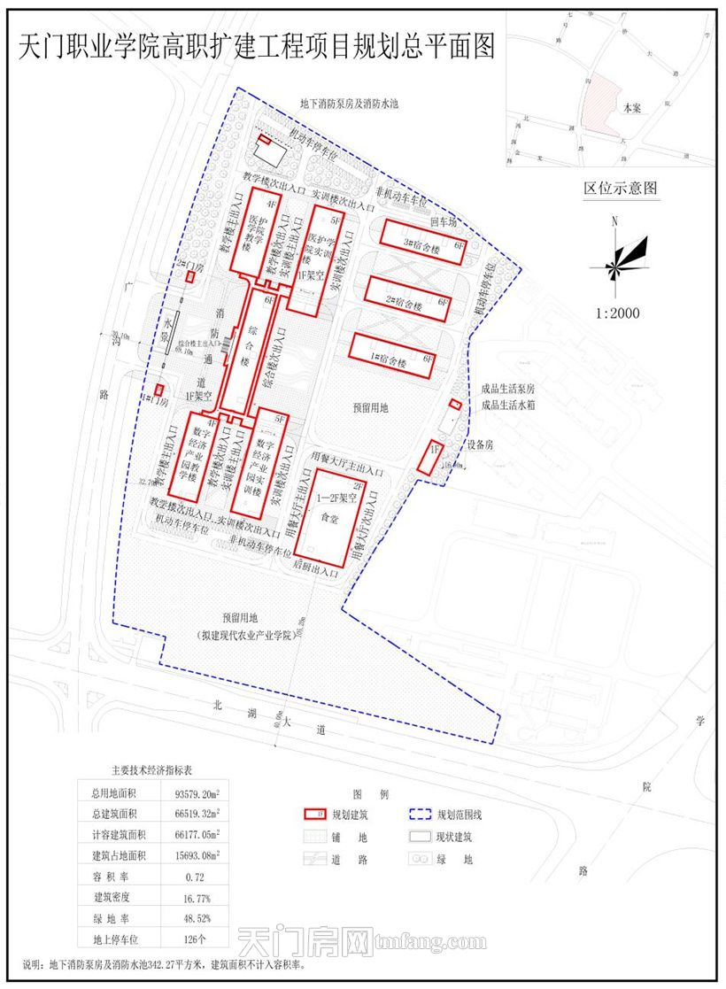 天门职业学院申报的天门职业学院高职扩建工程项目,位于北湖大道与广沟路交会处。规划拟新建5栋建筑及相关配套设施,其中1栋6层综合楼及附属教学楼,1栋2层食堂,3栋6层宿舍楼。项目总建筑面积为66519.32平方米,计容总建筑面积为66177.05平方米,容积率为0.72,日照分析满足规范要求,具体详见规划总平面图、日照分析图和效果图。经我局审查,拟同意批准该项目规划方案,现将拟批准的规划总平面图予以公示。有关单位或个人如对此规划有异议,请在公示期间向市自然资源和规划局提出书面异议书。