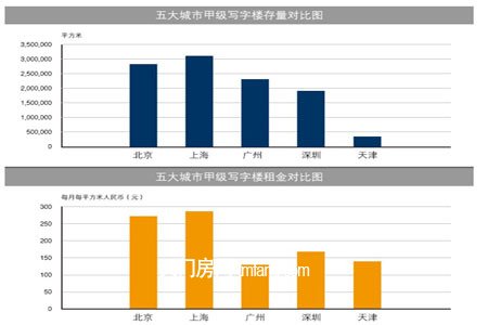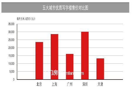 租金及价格方面,2011年季度,北京、上海、广州、深圳和天津五大城市(以下简称“五大城市”)甲级写字楼租金环比全线上涨。同时,南方主要城市写字楼需求回升速度更快,租金涨幅高于北方,广州和深圳的涨幅明显高于北京和天津。其中,深圳租金环比增幅大,为8.6%。受到新政影响,写字楼投资市场活跃,五大城市优质写字楼售价环比去年四季度上升,增幅在4%-9%。