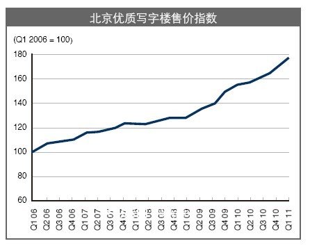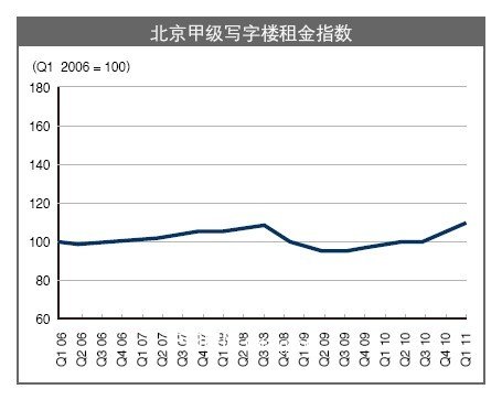 2011年季度,北京写字楼市场继续保持稳定增长态势。甲级写字楼平均租金达到每月每平方米273.5元,环比上涨5.2%。与去年季度比较,年租金增长率达到14.2%。