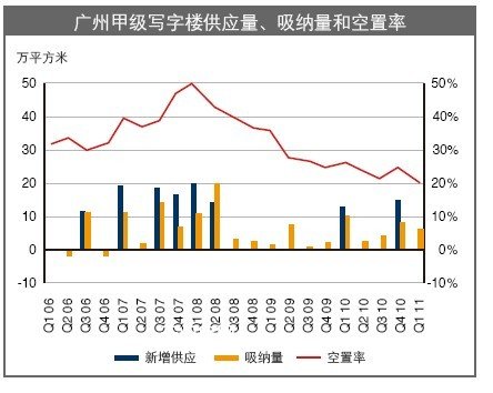 供给方面,受2010年广州亚运会举办影响,广州部分写字楼工期推迟。本季度无新增甲级写字楼进入市场。