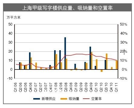供给方面,本季度上海无新增甲级写字楼入市,市场存量得以继续消化。上海甲级写字楼整体空置率降低到9.6%,相比去年四季度降低了3.1个百分点,达到金融危机以来的低点。