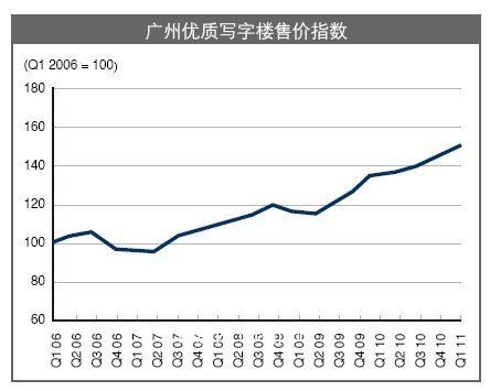 销售市场方面,由于限购令的颁布和实施,住宅市场受到打压,资金流转向商业地产市场,广州写字楼市场受此推动,表现活跃。2011年季度广州市优质写字楼平均售价达到每平方米17,384元,环比上升5.7%。其中,越秀区优质写字楼平均价格涨幅大,达到每平方米14 ,688元,环比上升8.8%;天河区写字楼价格高,达到每平方米19,787元,环比上升2.9%。