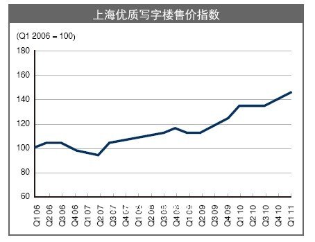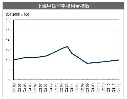 2011年季度,上海写字楼市场继续稳步回暖。截止三月底,甲级写字楼平均租金达到每月每平方米297.7元,环比上涨4.9%。与去年季度比较,年租金增长率达到10.9%。