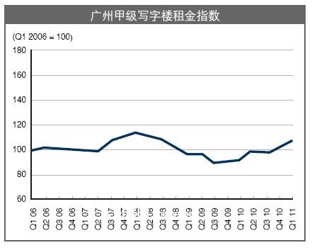 2011年季度,广州写字楼市场继续呈现上升态势。截止三月底,甲级写字楼平均租金达到每月每平方米128.5元,环比上涨5.7%。与去年季度相比,同比上涨15.6%。