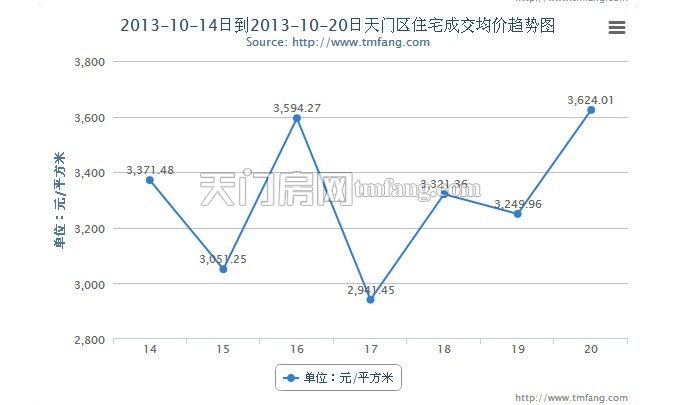 上周(10.14~10.20)天门地区住宅成交均价为3244.22元/平方米,房价比上周有所下降。