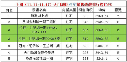 上周(11.11—11.17)天门城区住宅销售套数排行榜TOP5