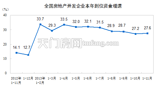 1-11月份,房地产开发企业到位资金109475亿元,同比增长27.6%,增速比1-10月份提高0.4个百分点。其中,国内贷款17667亿元,增长33.8%;利用外资475亿元,增长28.0%;自筹资金42742亿元,增长20.8%;其他资金48592亿元,增长31.9%。在其他资金中,定金及预收款30534亿元,增长32.1%;个人按揭贷款12657亿元,增长36.5%。