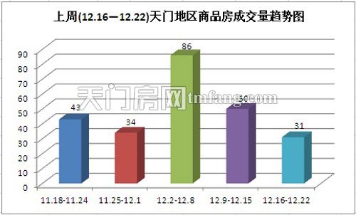 2013年12月16日 至 2013年12月22日天门城区销售总交易记录31套,面积2738平方米,金额9400713元,均价3433.42元/平米。其中住宅销售21套,销售面积2155平方米,销售总额为7129993元,均价3308.58元/平米;非住宅销售10套,销售面积583平方米,销售总额为2270720 元,均价3894.89元/平米。