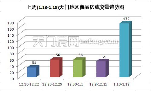 2014年01月13日 至 2014年01月19日天门城区销售总交易记录172套,面积18371平方米,金额65088533元,均价3543.00元/平米。其中住宅销售 170套,销售面积18204平方米,销售总额为63742902元,均价3501.59元/平米;非住宅销售2套,销售面积167平方米,销售总额为 1345631元,均价8057.67元/平米。