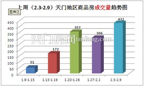上周(2.3-2.9)天门地区商品房成交432套,再一次打破天门2014马年楼市销售记录,根据一月天门楼市销量情况可以看出,天门岁末回家置业潮大大的带动了新春楼市大升温,春节7天假期销售与日俱增(天门新春马上有房 楼市周201套),为天门2、3月份的春季楼市拉开了的帷幕。