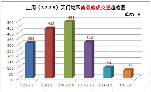 2014年03月03日 至 2014年03月09日天门城区销售总交易记录70套,面积7573平方米,金额28541081元,均价3768.79元/平米。其中住宅销售64套,销售面积6791平方米,销售总额为19485730元,均价2869.35元/平米;非住宅销售6套,销售面积782平方米,销售总额为9055351 元,均价11579.73元/平米。