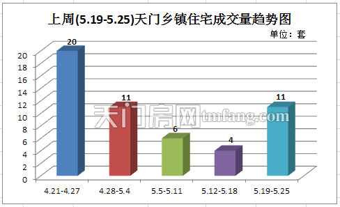 上周(5.19-5.25) )天门乡镇住宅成交量是11套,之前连续两周成交下滑的乡镇住宅,上周由于皂市的两个项目和天门南站附近的。个别项目同时出现销售,带动了乡镇住宅的整体成交量上升了。