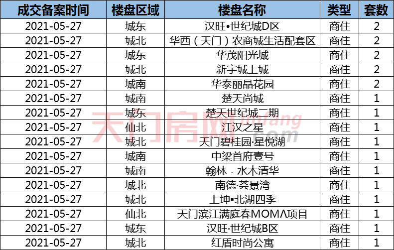 备注:此数据来源于数据中心,是天门在售各大楼盘成交备案数据,部分数据有延迟,仅供参考,如有疑虑可添加房网小编微信(tmfang005)具体咨询或修改!