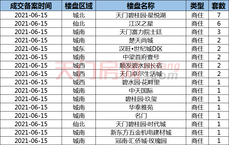 备注:此数据来源于数据中心,是天门在售各大楼盘成交备案数据,部分数据有延迟,仅供参考,如有疑虑可添加房网小编微信(tmfang005)具体咨询或修改!