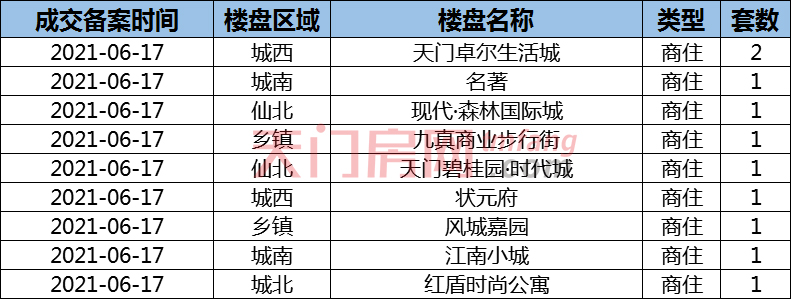备注:此数据来源于数据中心,是天门在售各大楼盘成交备案数据,部分数据有延迟,仅供参考,如有疑虑可添加房网小编微信(tmfang005)具体咨询或修改!
