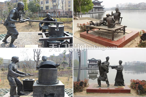 图中的四幅雕塑正是天门耳熟能详的民间故事,磨豆浆、纳凉、蒸菜、背媳妇……东湖周边处处可以看到的这样生动的雕塑,都贴切的反应了天门当地民俗,很有文化属性。