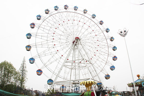 缤纷色彩的湖上摩天轮。东湖公园拥有凤之舞休闲广场、湖心岛旱喷广场、水幕电影喷泉等10大景区,是一座集民俗文化、休闲娱乐、生态湿地于一体的全开放式现代城市公园。