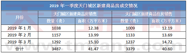 2019年1至3月,天门城区新建商品房销售3487套,销售面积41.47万平方米,同比增长6.17%;其中,新建商品住房销售3379套,销售面积40.60万平方米,同比增长9.05%。