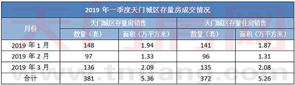 2019年1至3月,天门城区存量房成交381套,成交面积5.36万平方米,同比下降20.36%;其中,存量住房成交372套,成交面积5.26万平方米,同比下降19.33%。