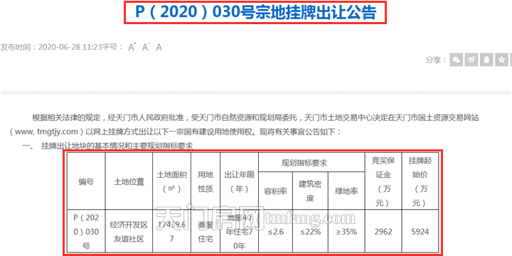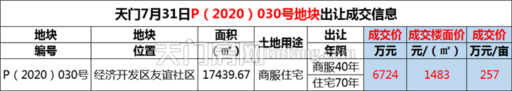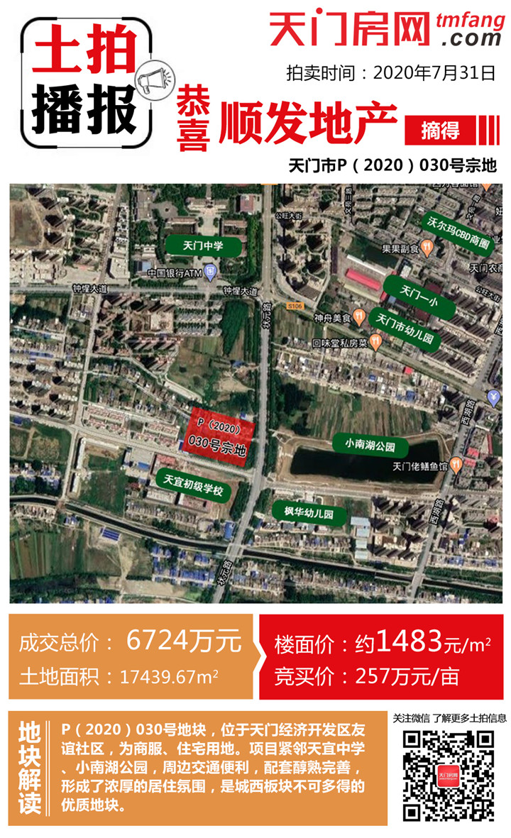 7月31日,位于天门经济开发区友谊社区P(2020)030号宗地,由顺发房地产开发有限公司以总价6724万元,楼面价1483元/㎡成功摘得。