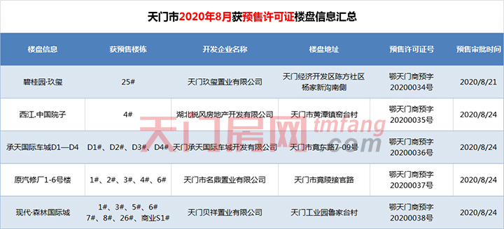 因此,小编整理了天门市8月《商品房预售许可证》新鲜出炉的项目,同时提醒购房群众,未取得《商品房预售许可证》的商品房不要购买,以免造成不必要的损失。