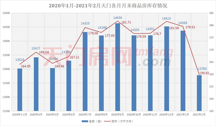 天门楼市市场上房源仍处于供过于求的状态,在2020年7月自2021年1月之间,已批准预售但尚未售出的商品住房库存量在1.4万套左右徘徊。开年来不少楼盘火爆销售,劲销不断,截止2月末,库存房源为12783套,虽然有了一定的降幅,但是总体量依旧高企。