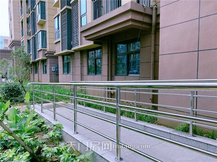 小区体量很大,入户一侧特意布置了斜道,布置不锈钢扶手,方便行动不便业主出行。