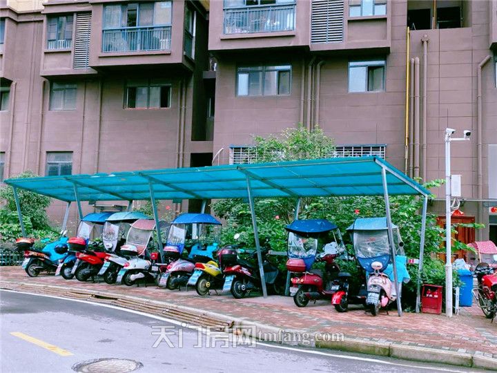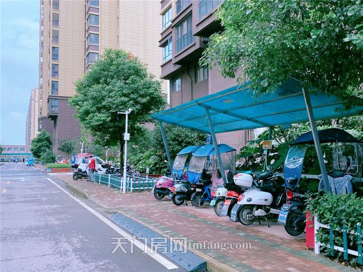 小区内的非机动车停车位,车辆整体看上去摆放有序,地面也干净清爽,看得出来有专人每天清理打扫。