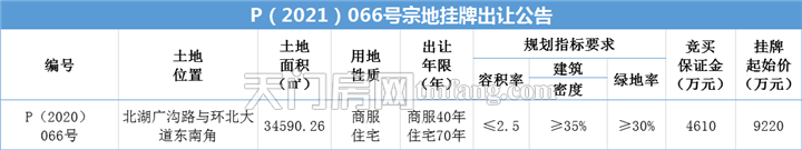 P(2020)066号地块,出让总面积约34590.26平方米(以实测面积为准),总起拍价约为9220万元,起拍楼面价约为1066元/㎡。