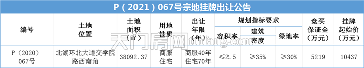 P(2020)067号地块,出让总面积约38092.37平方米(以实测面积为准),总起拍价约为10437万元,起拍楼面价约为1096元/㎡。