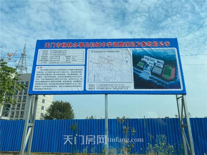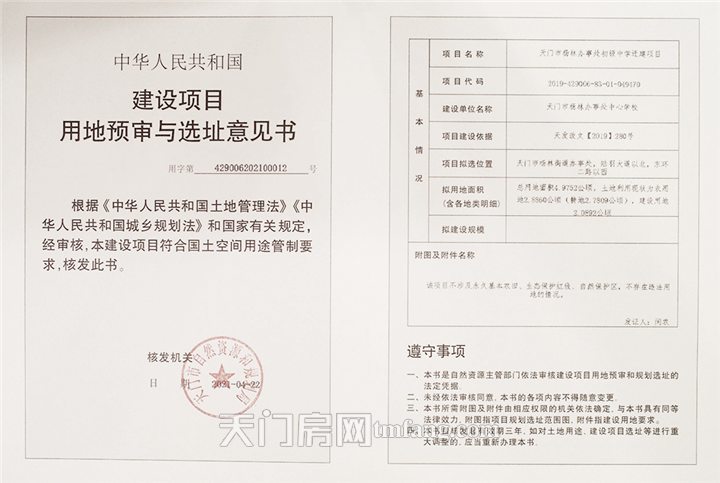 2021年4月22号,天门市杨林办事处初级中学正式办理了《建设项目用地预审与选址意见书》,也意味着项目已经完成前期土地权属程序。