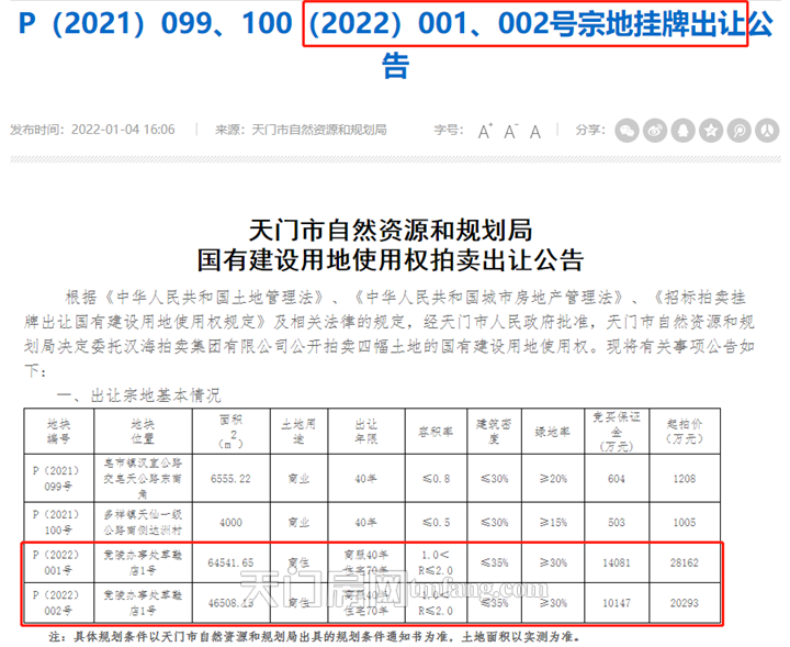 1月4日,天门市自然资源和规划局发布了两则国有建设用地使用权挂牌出让公告,涉及城西2宗地,地块编号为〔2022〕001、002,总挂牌面积为111049.8平方米,总起始价为48455万元。二宗地块将于2022年1月25日拍卖。