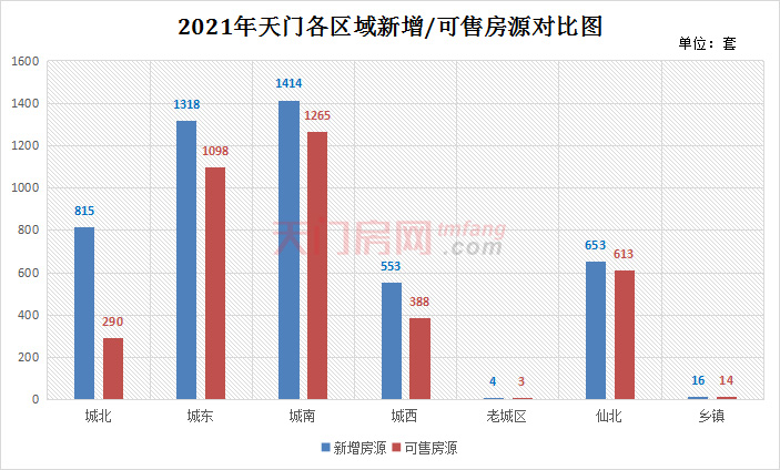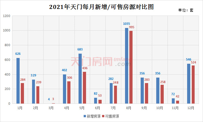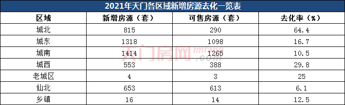 2021年1月至12月,天门楼市共有新增商品房房源4773套,其中可售房源3671套,已售房源1102套,去化率达23.1%。