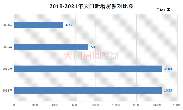 2021年整年天门新增房源共4773套,对比2020年,下降约34%。
