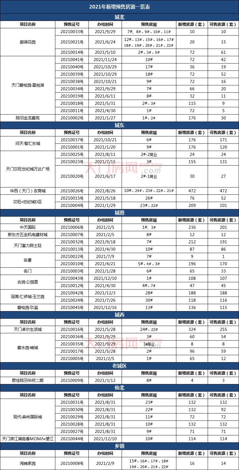 截止2021年12月31日的统计,2021年全年天门楼市共有21个楼盘获得45张预售证。