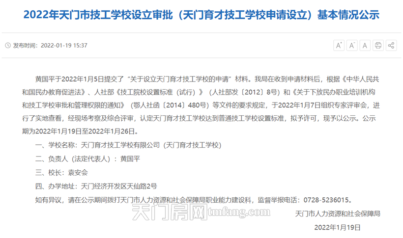 1月20日,天门市人力资源和社会保障局发布了2022年天门市技工学校设立审批(天门育才技工学校申请设立)基本情况公示,内容如下: