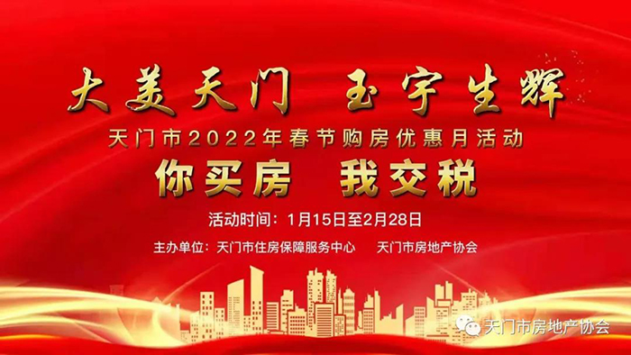 天门市房地产协会举办了2022年春节购房优惠月活动,1月15日正式启动,鼓励购房者购房。