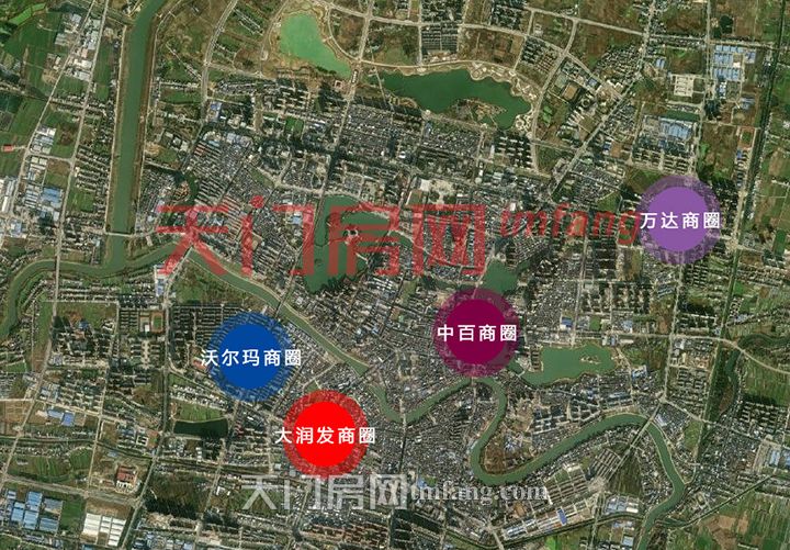 目前天门一城五区,除了城北外,其余板块皆有大型商圈:老城区有中百,城南有大润发,城西有沃尔玛,城东有万达。