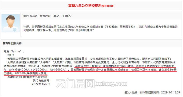 3月1日有网友在天门市委书记板块留言:高新园九年公立学校的规划问题?