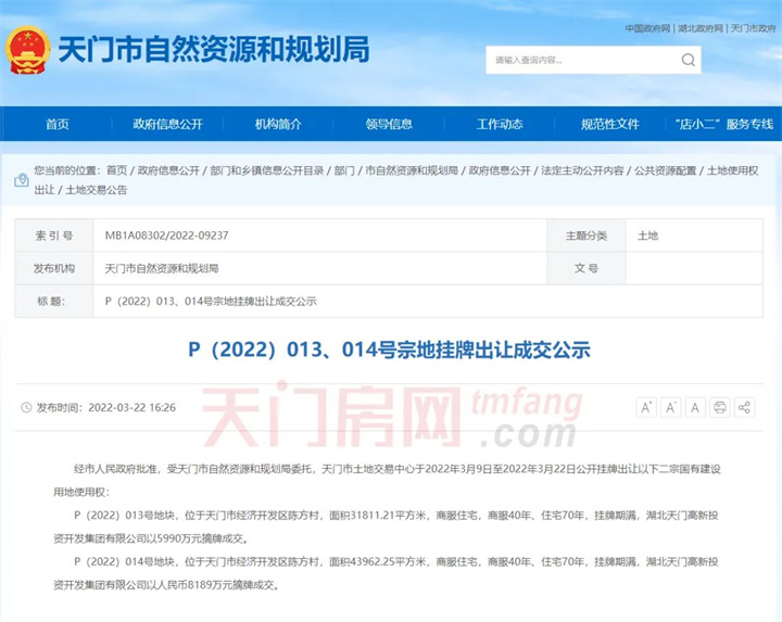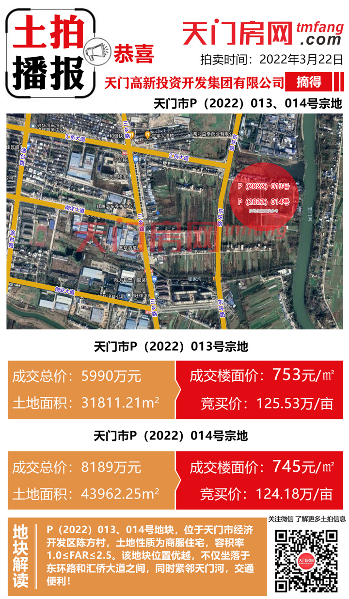 P(2022)013号地块,位于天门市经济开发区陈方村,面积31811.21平方米,商服住宅,商服40年、住宅70年,挂牌期满,湖北天门高新投资开发集团有限公司以5990万元摘牌成交。