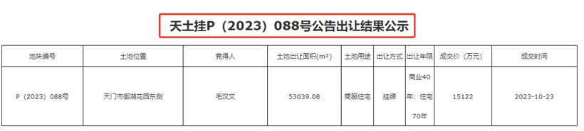 10月23日,备受关注的天门土拍结果出炉!