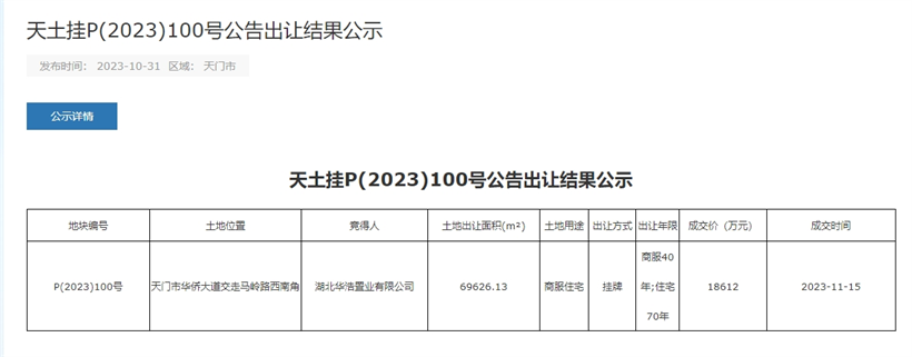 2.P(2023)100地块,被湖北华浩置业有限公司以18612万元摘得,成交楼面价约1782元/m²!