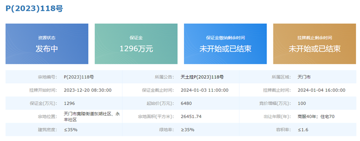 11月30日,天门市国有建设用地使用权网上挂牌出让公告发布P(2023)188号地块,该地块位于天门市竟陵街道东湖社区、永丰社区,起拍总价6480万元,起始楼面价约1531元/㎡,具体内容如下: